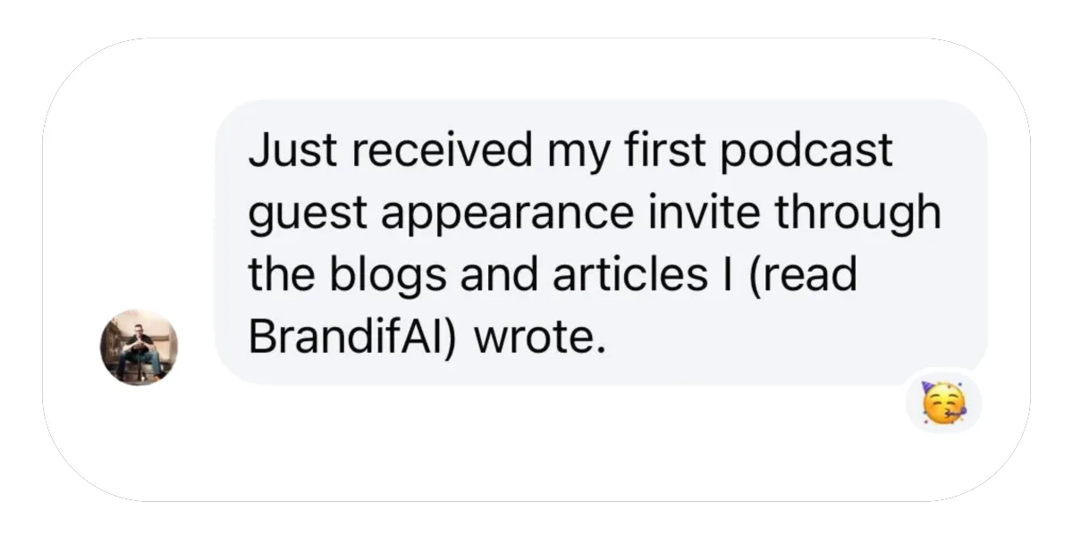 BrandifAI is designed to help you avoid the "salesy" trap by focusing on authority building rather than direct promotion. When you're featured as an expert on podcasts your customers already listen to, or quoted in publications they already read, you're providing value in spaces they trust- not interrupting them with ads or sales pitches before you've earned their trust.